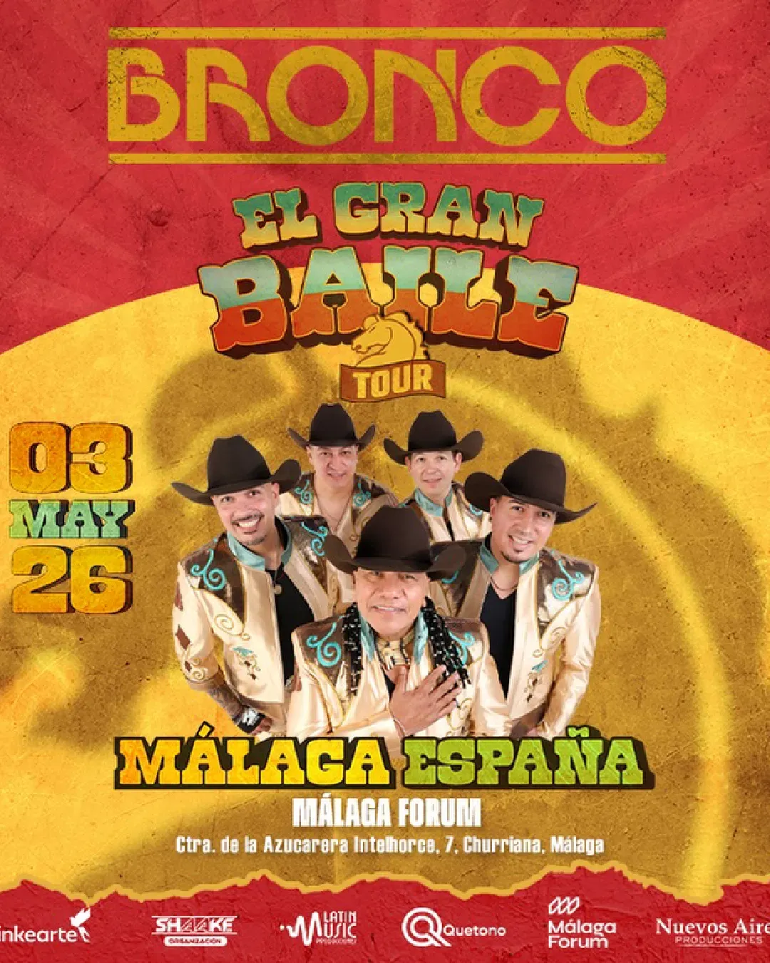 Prepárate para una velada llena de fiesta y emoción con El Gran Baile Tour de Bronco, la icónica agrupación mexicana con casi cinco décadas de trayectoria que ha marcado la historia del regional mexicano. El show recorre sus éxitos más queridos —como “Que no quede huella”, “Oro” o “Nunca voy a olvidarte”— y promete hacer cantar y bailar al público de principio a fin. Con una producción vibrante, sonidos que han trascendido generaciones y un ambiente que celebra su legado musical, este concierto es un reencuentro especial para fans de todas las edades.